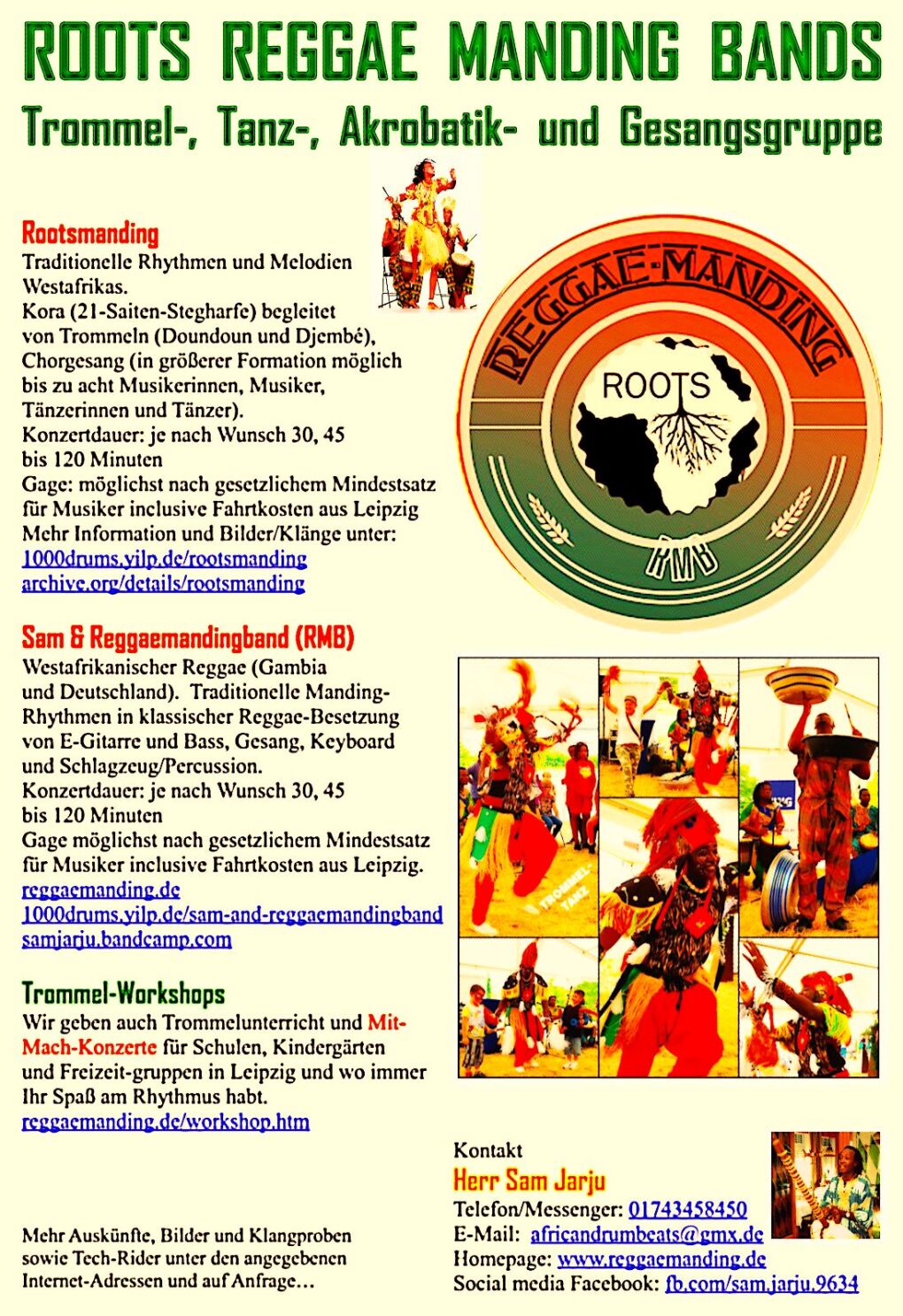 Sam Jarju – Musiker & Musikpädagoge aus GambiaIch bin Sam Jarju, geboren in Gambia, Westafrika. Schon als Kind war Musik meine Leidenschaft. Ich spielte Trommel, sang im Schultheater und wurde später Lehrer für afrikanische Trommel und Gesang in Bakau. Seit 1992 bin ich als professioneller Musiker aktiv – unter anderem mit der Super Juffureh Band und der Salam Band von Tatadingding Jobateh. Ich beherrsche auch die Kora und war an mehreren CD-Produktionen beteiligt. Seit 2000 lebe ich in Deutschland. Ich gründete die Sam & Reggae Manding Band und wohne heute in Leipzig, wo ich als Musiker, Musiklehrer und Kulturveranstalter arbeite. Afrikanische Künstler*innen für Ihre VeranstaltungKunst, Musik & Kultur aus Afrika – authentisch, lebendig, verbindend Sie suchen nach besonderen kulturellen Highlights für Ihre Veranstaltung? Unsere Künstler*innen bringen nicht nur ihr Talent, sondern auch ihre kulturelle Perspektive mit – für authentische, lebendige und interaktive Formate, die verbinden, begeistern und bereichern. Unser Angebot: